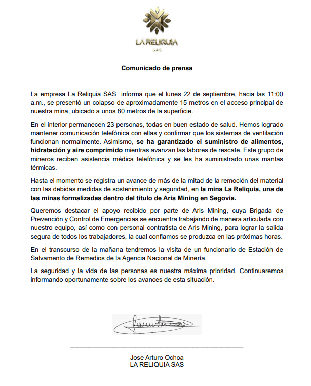 En ese sentido, la empresa también resaltó el respaldo de Aris Mining, dueña del título minero, cuya Brigada de Prevención y Control de Emergencias trabaja de manera articulada con el equipo de La Reliquia. Además, a las labores se unió la Agencia Nacional de Minería (ANM), que desplazó personal de la Estación de Salvamento de Remedios. Esta última entidad también compartió información, en la cual aseguraron que están acompañando el operativo de rescate de los mineros.