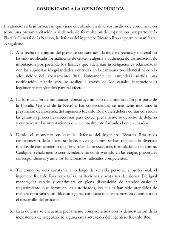 En el comunicado dirigido a la opinión pública, el jurista fue enfático en señalar que “a la fecha de emisión del presente comunicado, la defensa técnica y material no ha sido notificada formalmente de citación alguna a audiencia de formulación de imputación”. Además, precisó que solo se entenderá surtida una notificación cuando esta se realice “a través de los canales institucionales legalmente establecidos”. También aclaró que las investigaciones mencionadas incluyen tanto las supuestas irregularidades en la campaña como la adquisición del apartamento 901, hechos que igualmente hacen parte del proceso en curso.