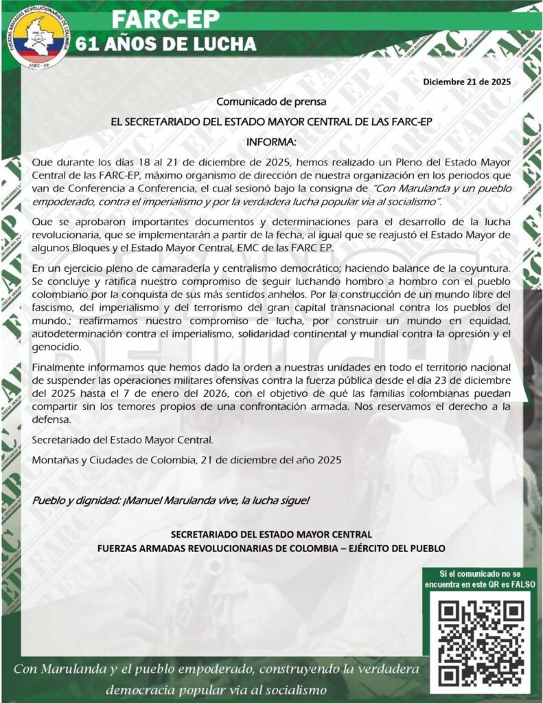 Las disidencias de las FARC bajo el mando de alias Iván Mordisco anunciaron un cese temporal de hostilidades contra la Fuerza Pública en todo el país. La orden, divulgada por el Secretariado del Estado Mayor Central, comenzará a regir desde las 11:00 p.m. del martes 23 de diciembre de 2025 y se extenderá hasta el miércoles 7 de enero de 2026.
