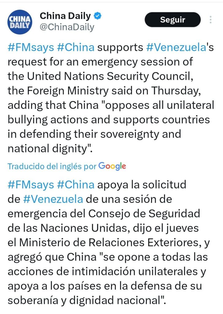 El respaldo chino se conoció tras una conversación telefónica entre el canciller chino, Wang Yi, y su homólogo venezolano, Yván Gil, en la que Beijing reiteró su rechazo a cualquier forma de coerción unilateral y defendió el derecho de los Estados a proteger su soberanía y dignidad nacional. Desde la diplomacia china se insistió en que Venezuela puede desarrollar cooperación internacional basada en beneficios mutuos, una postura que, según Beijing, cuenta con comprensión y apoyo dentro de la comunidad internacional.