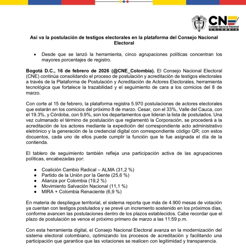 “Con corte al 15 de febrero, la plataforma registra 5.970 postulaciones de actores electorales que estarán en los comicios del próximo 8 de marzo. Cesar, con el 33%, Valle del Cauca, con el 19.3%, y Córdoba, con 9.9%, son los departamentos que lideran la lista de postulados”, se lee en el comunicado.