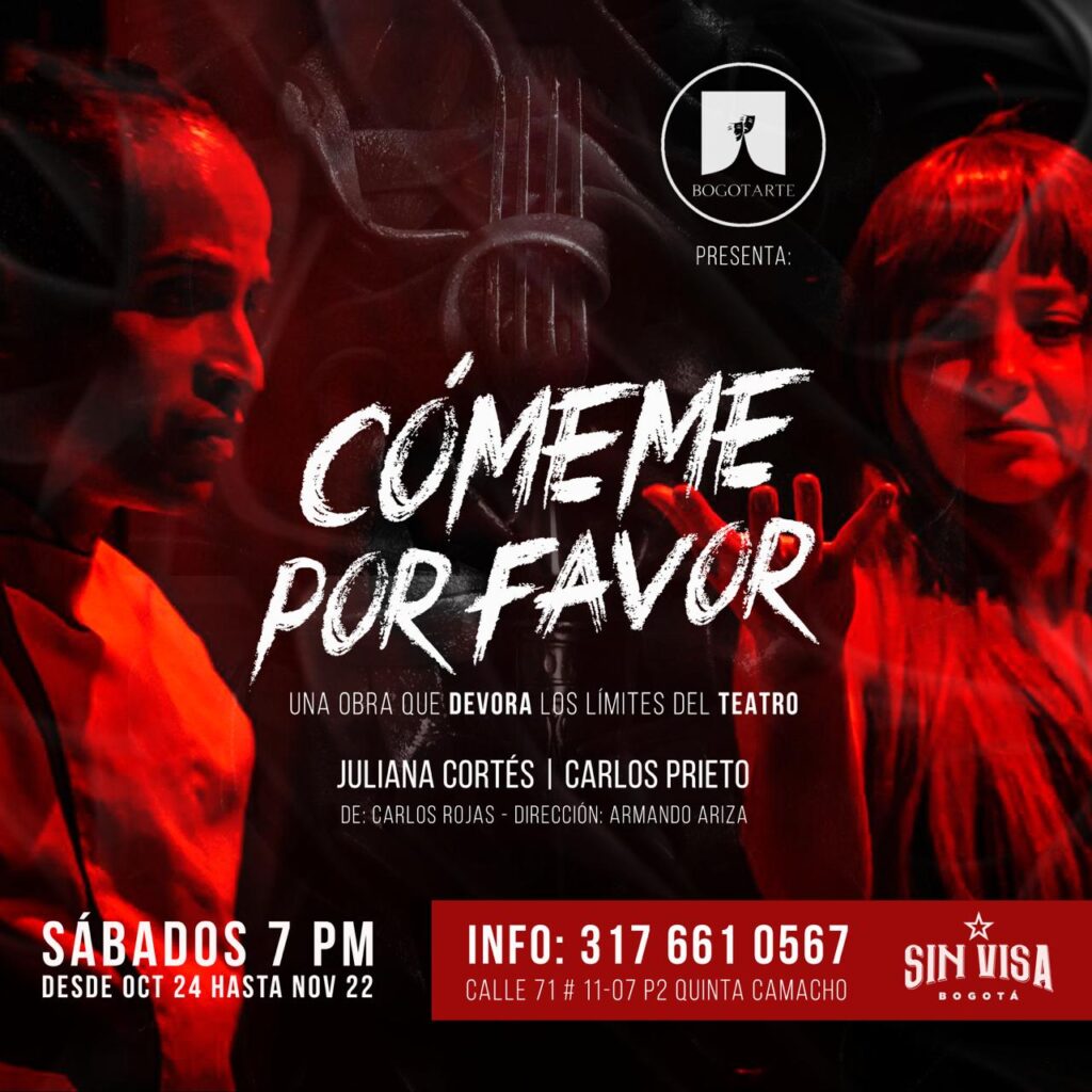 1 noviembre, 2025El pasado viernes 24 de octubre de 2025, el Café Cultural Sin Visa, en la cultural localidad de Chapinero, se convirtió en un escenario ardiente donde el teatro dejó de ser representación para transformarse en experiencia. Bajo la dirección de Armando Ariza y la pluma del dramaturgo Carlos Rojas, la obra ¡Cómeme, por favor! se presentó como un ritual entre el deseo y la destrucción, la carne y el pensamiento.