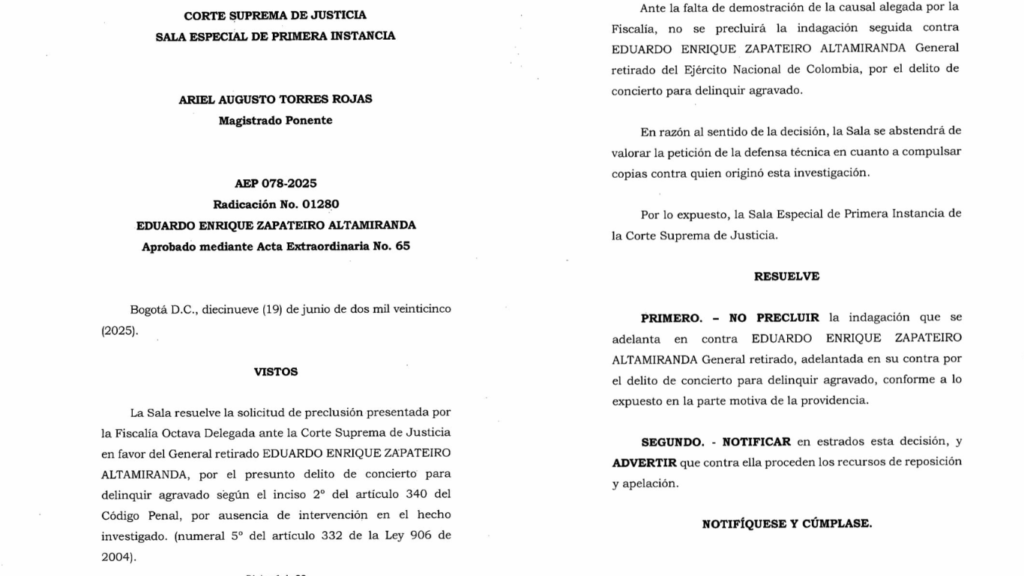 La Sala de Instrucción de la Corte Suprema de Justicia decidió este viernes mantener activa la investigación penal contra el general en retiro Eduardo Zapateiro, excomandante del Ejército Nacional, por el presunto delito de concierto para delinquir agravado. El alto tribunal negó la solicitud presentada por la Fiscalía General de la Nación para archivar el caso, argumentando que aún existen elementos suficientes que justifican avanzar en la etapa de instrucción.