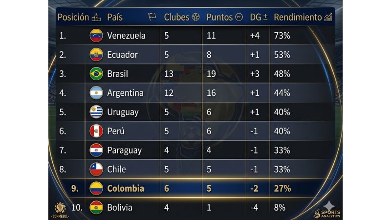 Aunque Brasil acumuló más puntos totales por tener más equipos, su rendimiento porcentual lo ubica por detrás del líder, lo que evidencia un inicio atípico en el continente.
