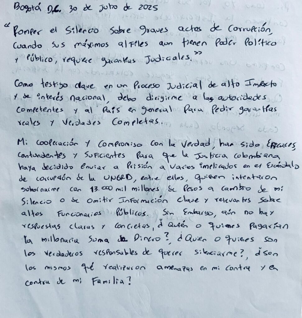 El exsubdirector de la Unidad Nacional para la Gestión del Riesgo de Desastres (UNGRD), Sneyder Augusto Pinilla Álvarez, condenado por corrupción, envió una nueva carta manuscrita desde su lugar de reclusión en el Cantón Sur de Bogotá. En el documento, fechado el 30 de julio de 2025, el exfuncionario denuncia haber sido objeto de un intento de soborno por $13.000 millones de pesos, presuntamente ofrecidos para evitar que revelara información comprometedora sobre el escándalo que involucra a altos funcionarios del Gobierno Nacional.
