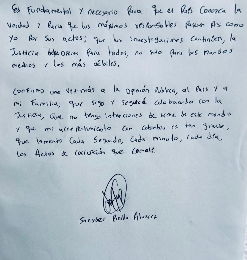 En la carta, Pinilla afirma que “romper el silencio sobre graves actos de corrupción, cuando sus máximos alfiles aún tienen poder político y público, requiere garantías judiciales”. El exfuncionario solicita protección para él y su familia, tras recibir amenazas que, según advierte, ponen en riesgo su vida. “No tengo intenciones de irme de este mundo”, escribió, en una de las frases que llamaron la atención en el documento.
