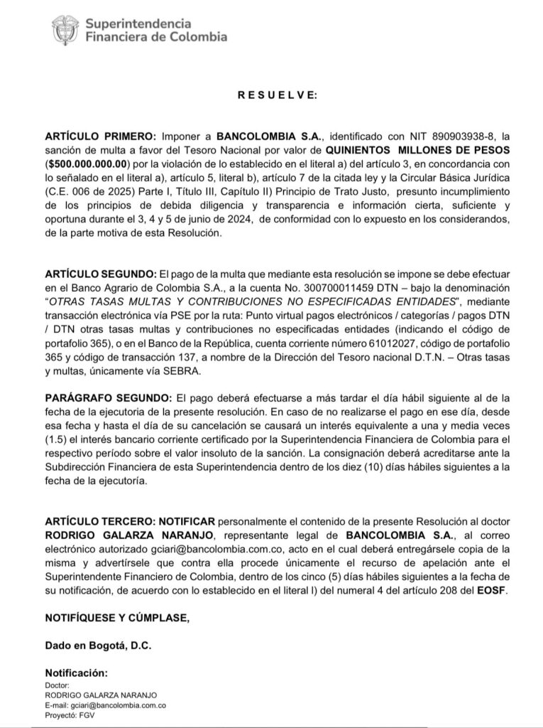 La resolución también advierte que Bancolombia incumplió el principio de información cierta, suficiente y oportuna, al no brindar explicaciones adecuadas sobre la duración y alcance de las interrupciones. En consecuencia, se ordenó el pago de la multa al Tesoro Nacional por valor de quinientos millones de pesos.