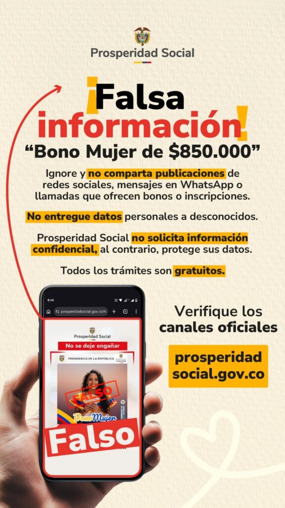 13 marzo, 2026La entidad gubernamental Prosperidad Social emitió este viernes una alerta sobre la circulación de información falsa en redes sociales y plataformas digitales que promete un supuesto “Bono Mujer de $850.000” dirigido a mujeres mayores de 18 años. Según el comunicado oficial, el Gobierno nacional no ha creado ningún programa con ese nombre.