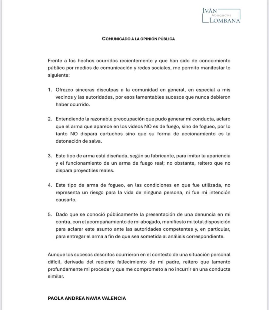 Por su parte la mujer registrada disparando, identificada como: Paola Andrea Navia Valencia, emitió un comunicado ofreciendo disculpas y asegurando que, aunque su acto fue injustificable, no representó un riesgo para la vida de nadie.
