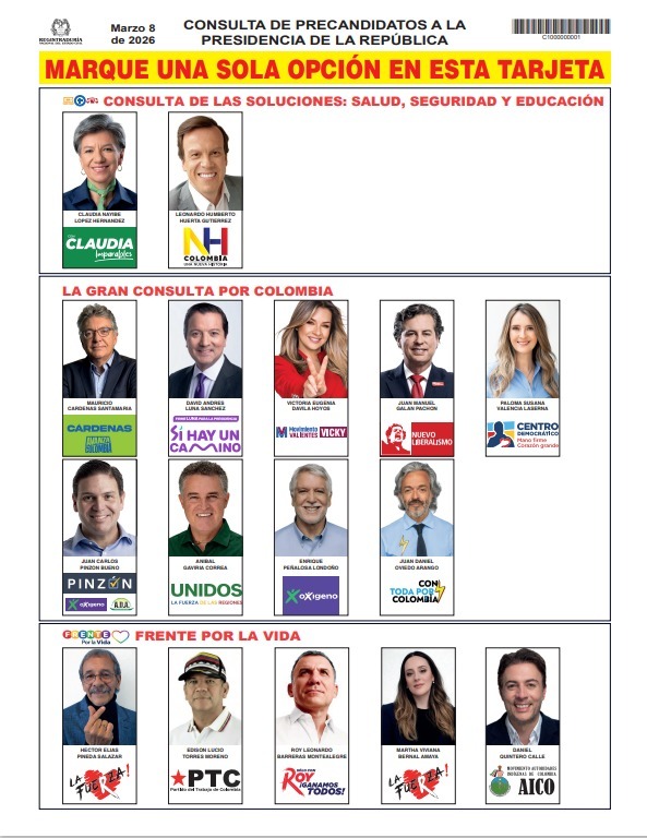 La Registraduría ratificó que, para garantizar la confidencialidad del sufragio, solo habrá una tarjeta electoral para todas las consultas. Bajo este esquema, el ciudadano podrá marcar una única opción entre los 16 precandidatos inscritos. Si el elector marca más de un candidato o selecciona opciones de distintas consultas, el voto será anulado para este tarjetón, aunque los sufragios por Senado y Cámara seguirán siendo válidos si los otros tarjetones se diligencian correctamente.