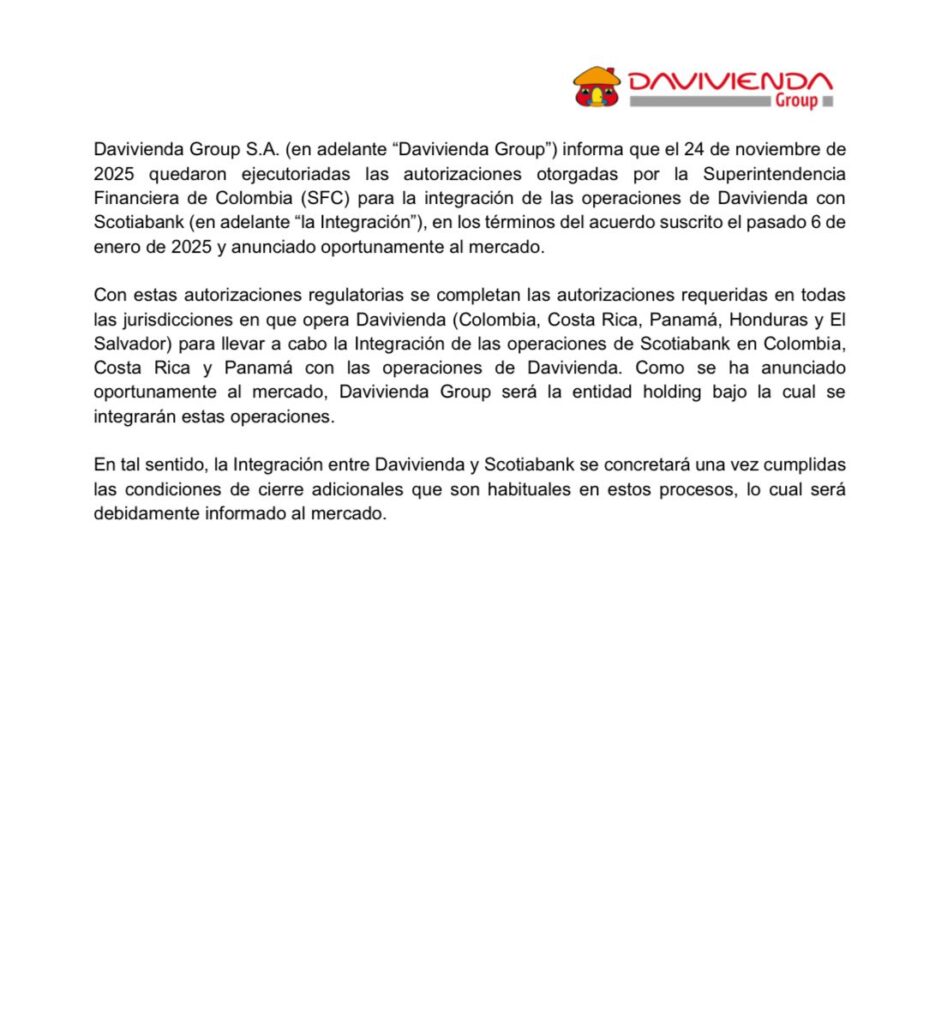 24 noviembre, 2025Davivienda Group S.A. informó este lunes 24 de noviembre que quedaron en firme las autorizaciones de la Superintendencia Financiera de Colombia para avanzar en la integración de sus operaciones con Scotiabank, un proceso iniciado desde enero de este año.